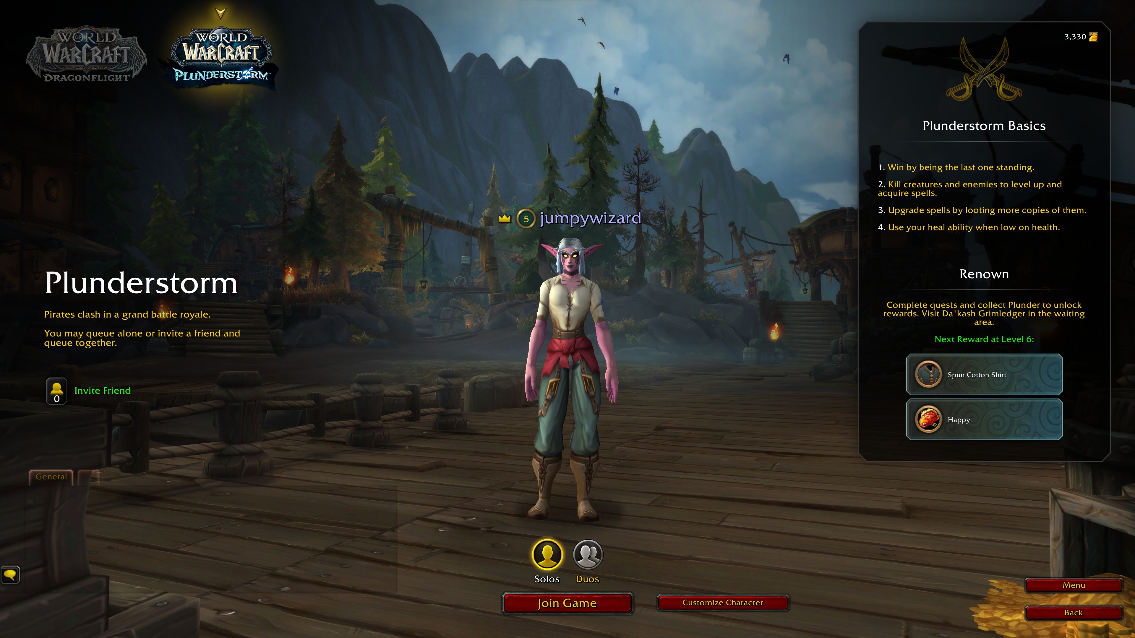 After making a Plunderstorm character, players can queue solo or with a partner and glide down on the wings of a parrot into Arathi Highlands, a zone that will be well-familiar to longtime WoW players but has been repurposed as the mode's battle royale map. Up to 60 players will be in a single match, all competing to be the last pirate standing. Players will only have one life, though a duo partner can revive a fallen teammate. After death, players can stick around and spectate other players, should they so choose.